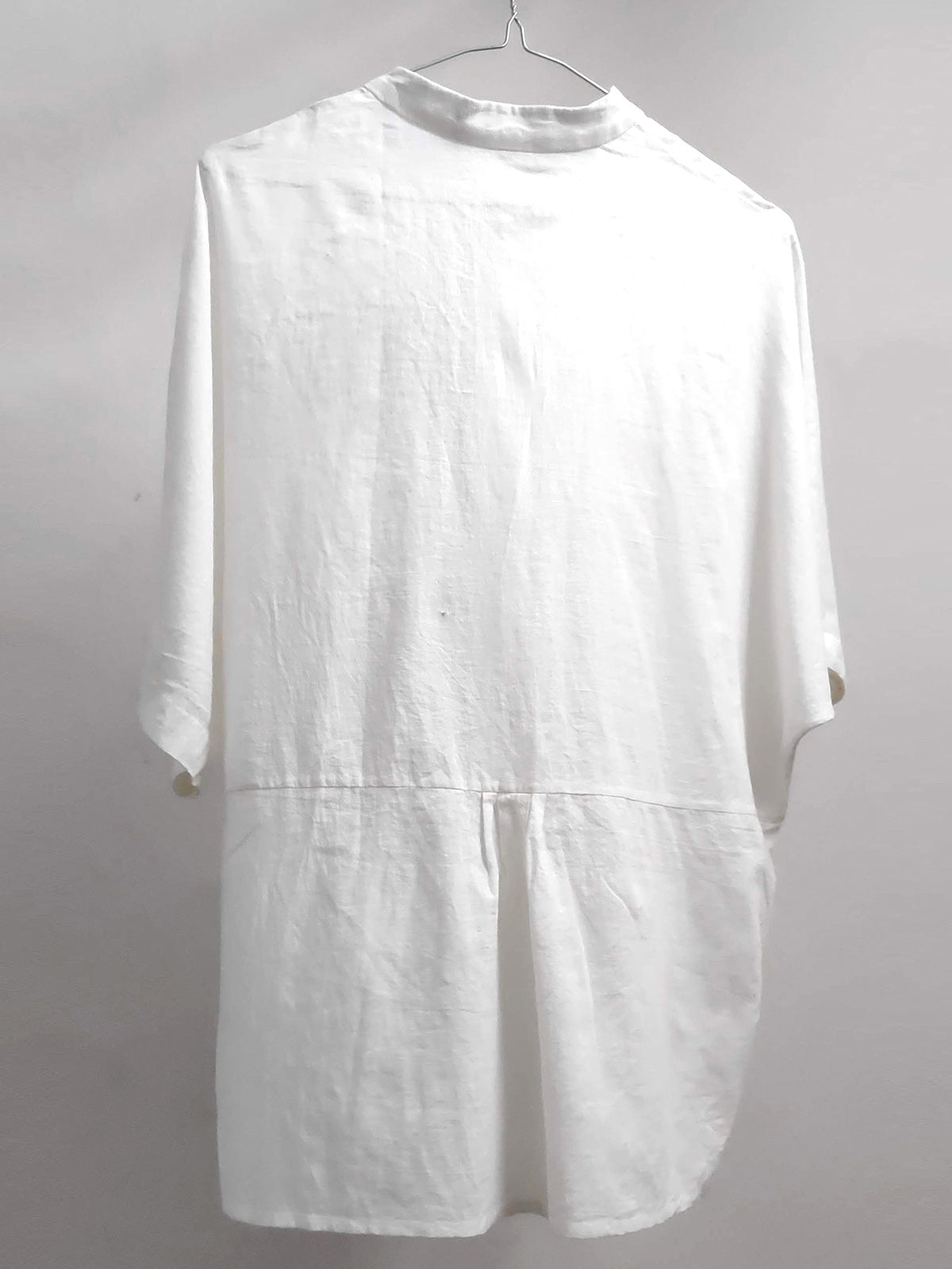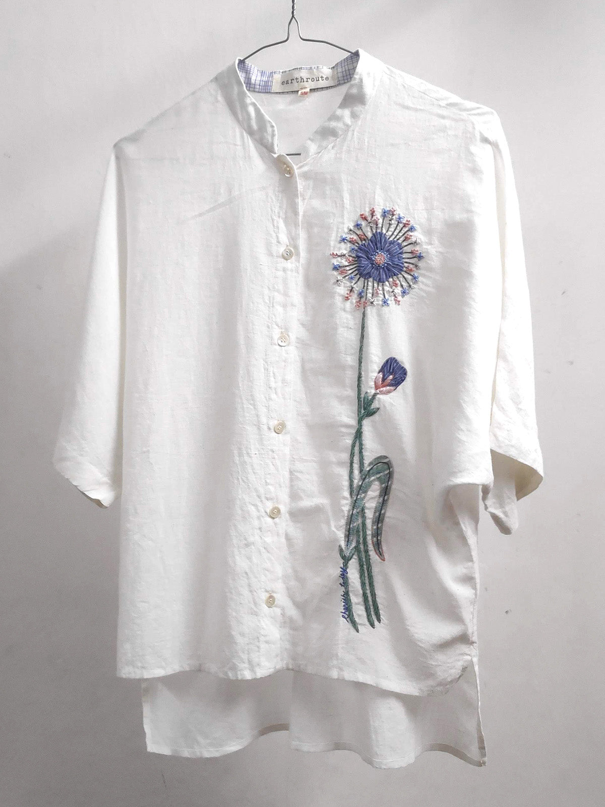 This handwoven cotton kimono shirt has a high-low hemline and has hand embroidered floral applique. The mandarin collar is complemented by a tonal contrast trim, front open button placket with mother of pearl button details.