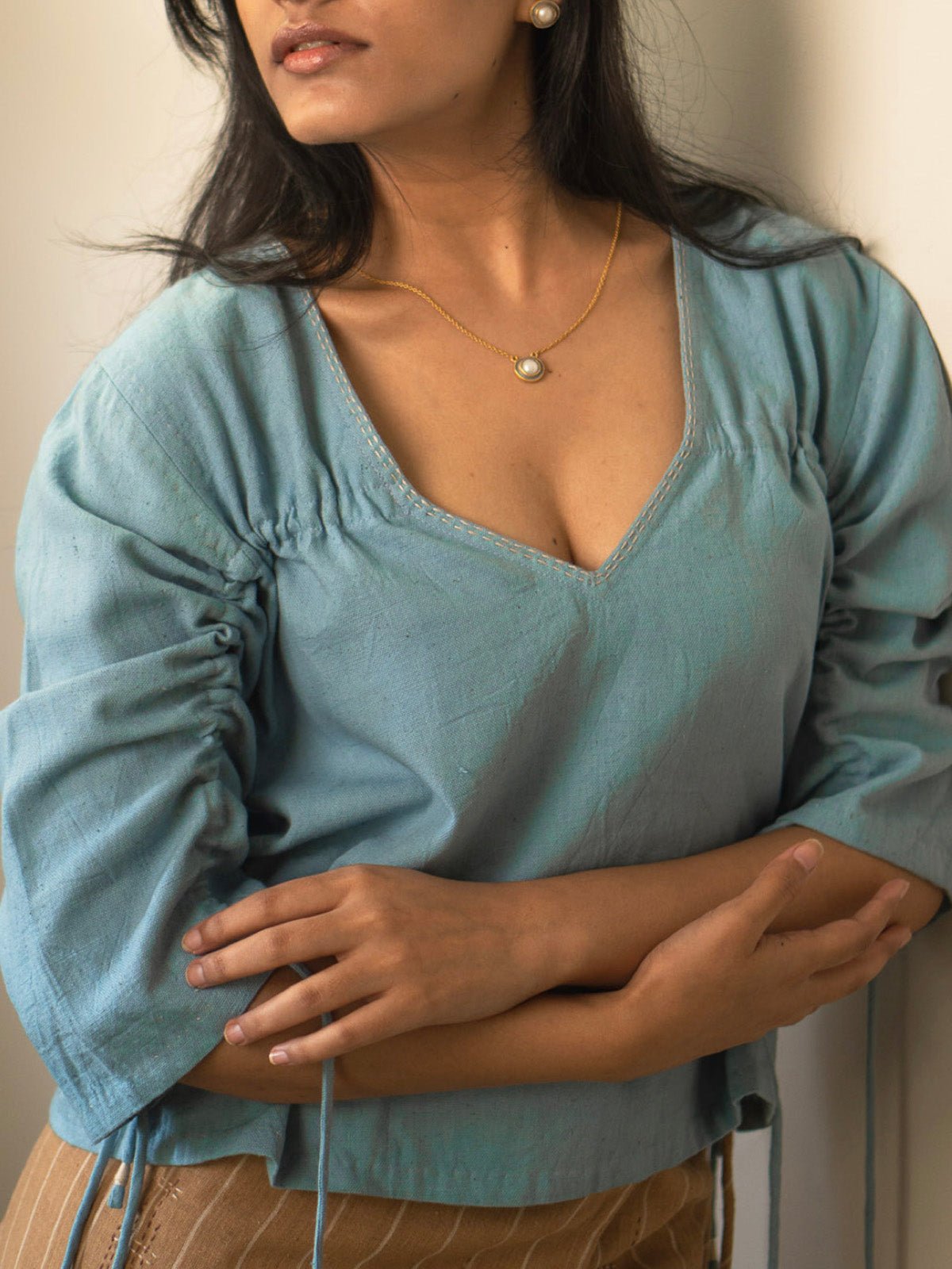 A sustainable masterpiece crafted from 100% Kala Cotton fibers and natural materials, dyed using Indigo and Turmeric for a dreamy blue hue we call Partly Cloudy. Its dynamic silhouette features adjustable drawstrings for sleeve length and overall style, while subtle gathers and a feminine flair add timeless charm. With Mother of Pearl buttons and ethically made in India, this biodegradable garment embodies eco-conscious fashion, showcasing traditional weaving techniques and unique variations in color and texture. Join the journey of sustainability with this versatile, ethical, and truly exquisite blouse.