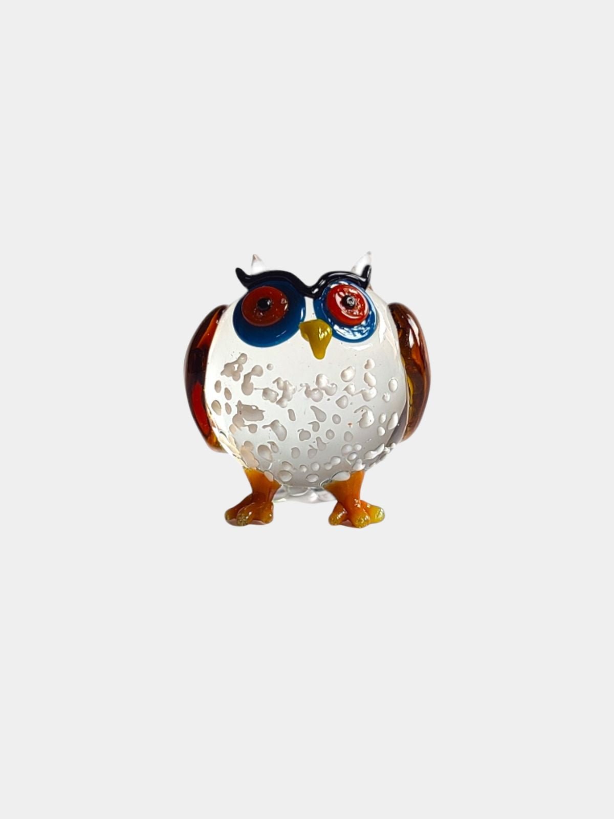 This playful glass owl is handcrafted using the flame-blown technique, featuring a white body with bright red, blue, and amber details. Its wide eyes and colorful charm make it a standout piece for any desk, shelf, or gift box.