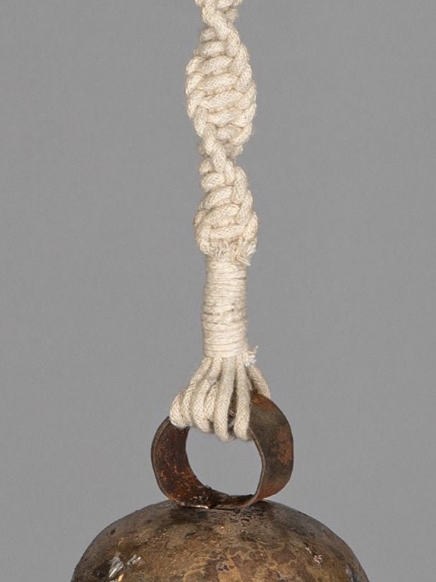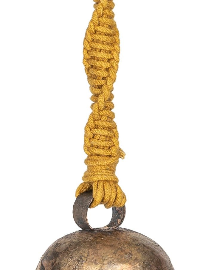 These bells are sourced from the desert lands of Nirona, near Kachchh (Gujarat) where they were initially used to identify cattle. Each bell is handcrafted from scrap iron sheets and coated with copper, and used as a modern decorative home accent with a beautifully hand-knotted wall hanging.