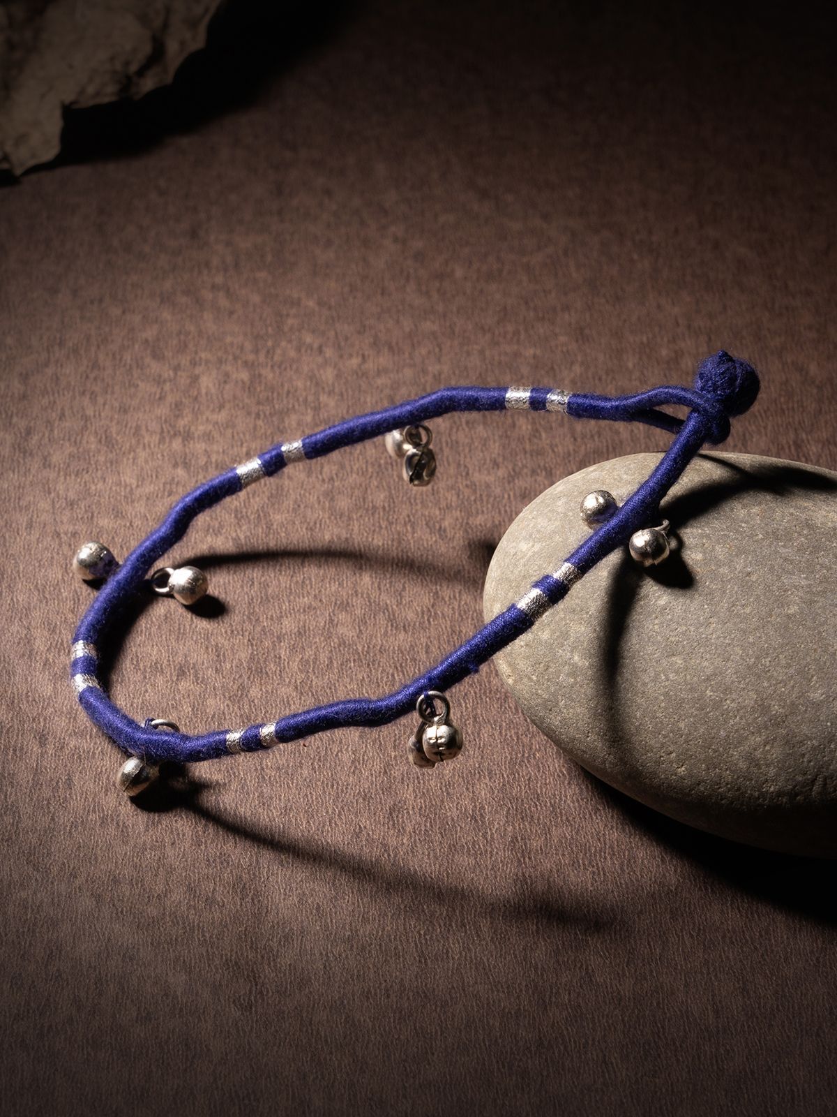 A playful, ethnic-inspired accessory, this handcrafted Patwa thread anklet features vibrant blue threadwork accented with silver thread detailing and metallic ghungroo beads. The gentle sound of the dangling beads adds charm to every step, making it perfect for festive, casual, or boho-inspired outfits.