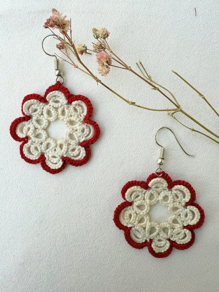 Beautifully crafted with cotton thread using the age-old technique of tatting, these earrings feature intricate lacework created stitch by stitch with shuttle tatting. Handmade with great care, each pair is exclusively crafted using this traditional method. These super cool, extremely lightweight earrings are versatile enough to complement any attire, ensuring you can wear them all day with ease. As artisanal items entirely made and decorated by hand, small imperfections denote the originality of the product. So, hop on board and add a touch of artisanal charm to your ensemble!