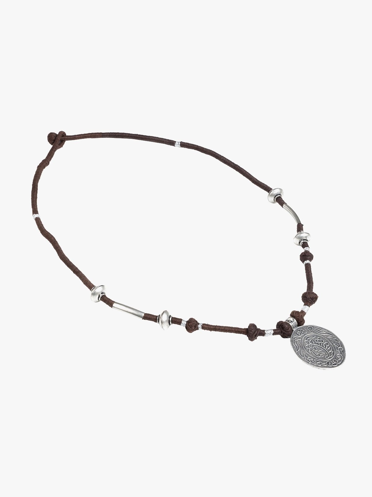 Celebrate timeless craftsmanship with this handcrafted Patwa thread necklace, featuring earthy brown cotton threads and antique silver-tone accents. The design is elevated with intricate knots and metallic beads, leading to a detailed coin-style pendant that reflects rustic charm and bohemian appeal.