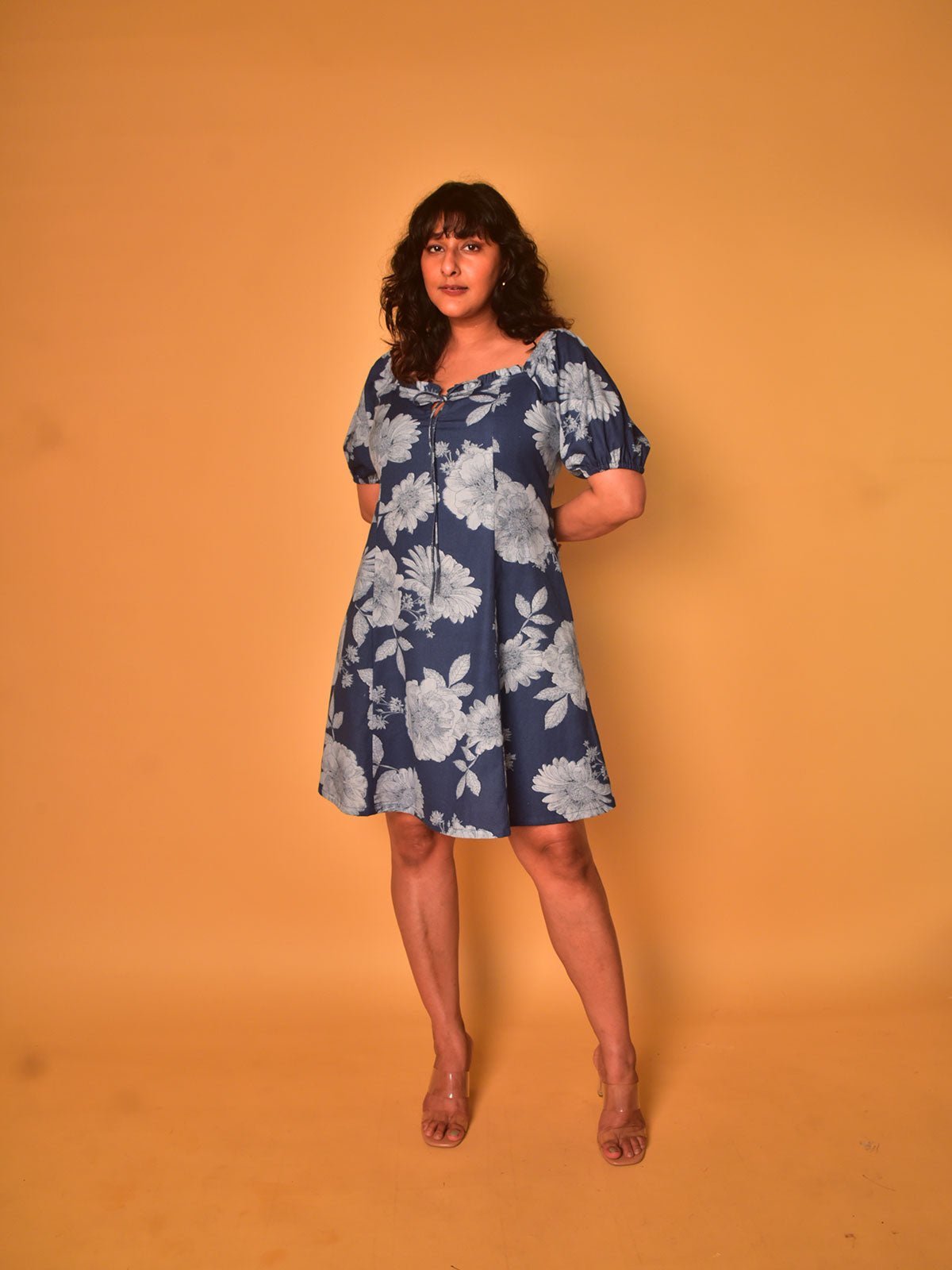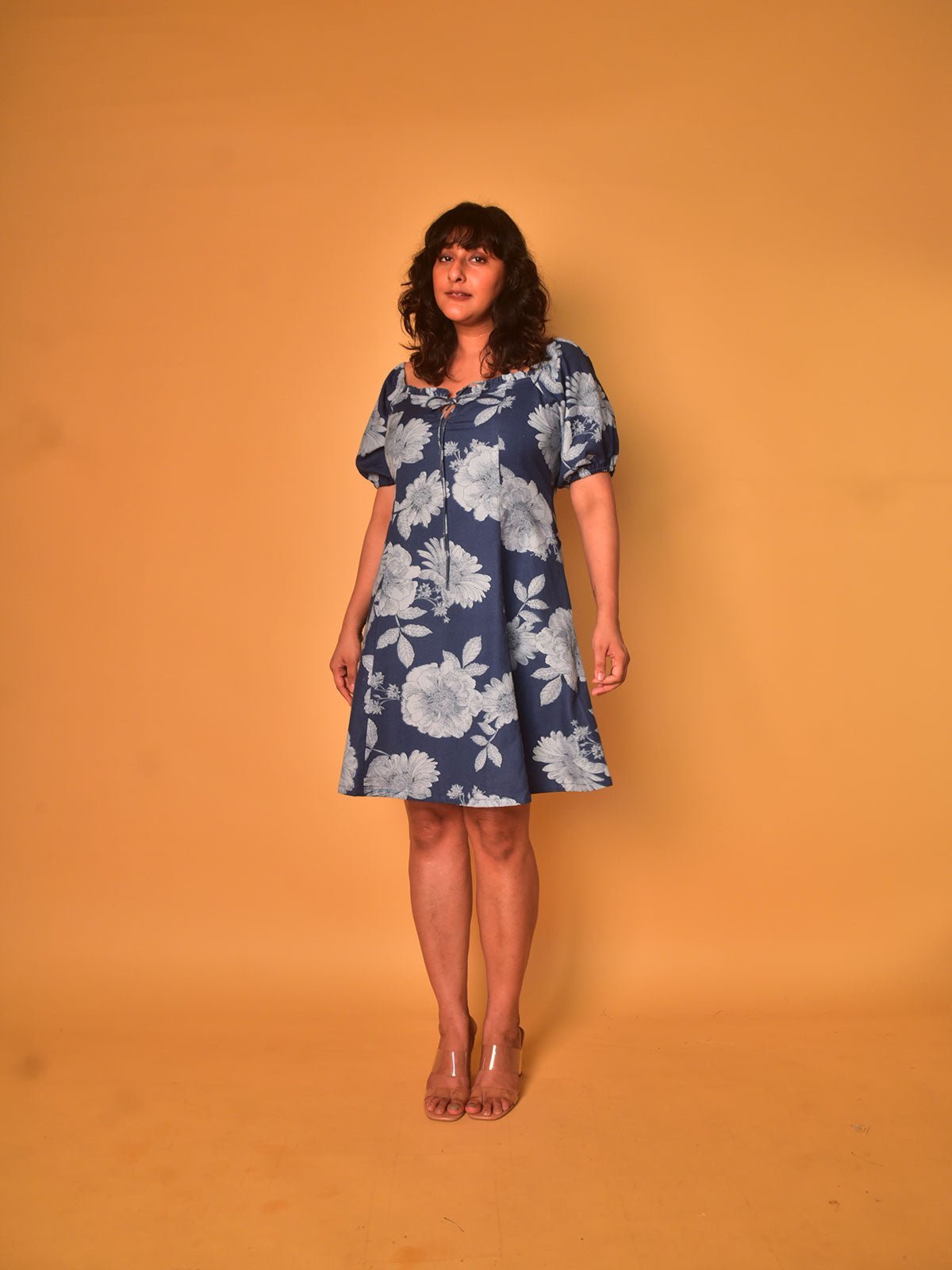 This flirty piece is cut in blue floral printed cotton, with a tie at the neck and delicate collar detailing. It has short puffed sleeves with elastic cinch, and elastic at the shoulders so you can wear it off your shoulders too! This three-paneled dress is cute and comfy, it's all things perfect in one little dress!