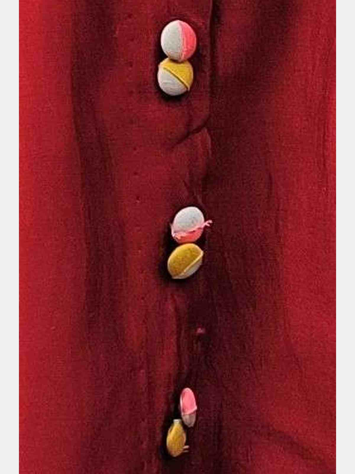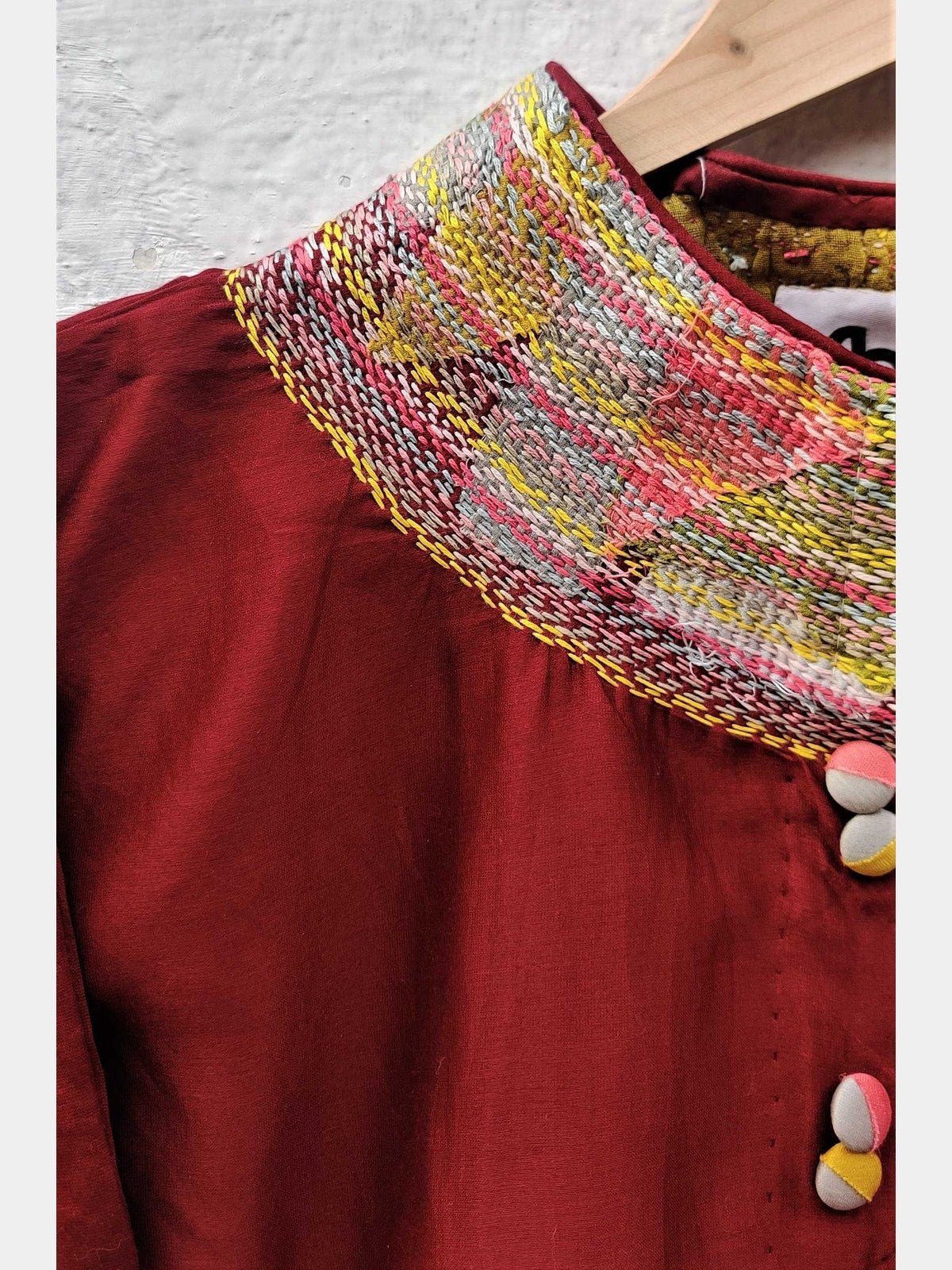 Women Maroon Chanderi crop top has round neck uplifted with multi-colour patch work and hand embroidery Sujani has centre front fabric button detail with hook and eye closure, and half roll-up sleeves accentuated with button-hole stitch.