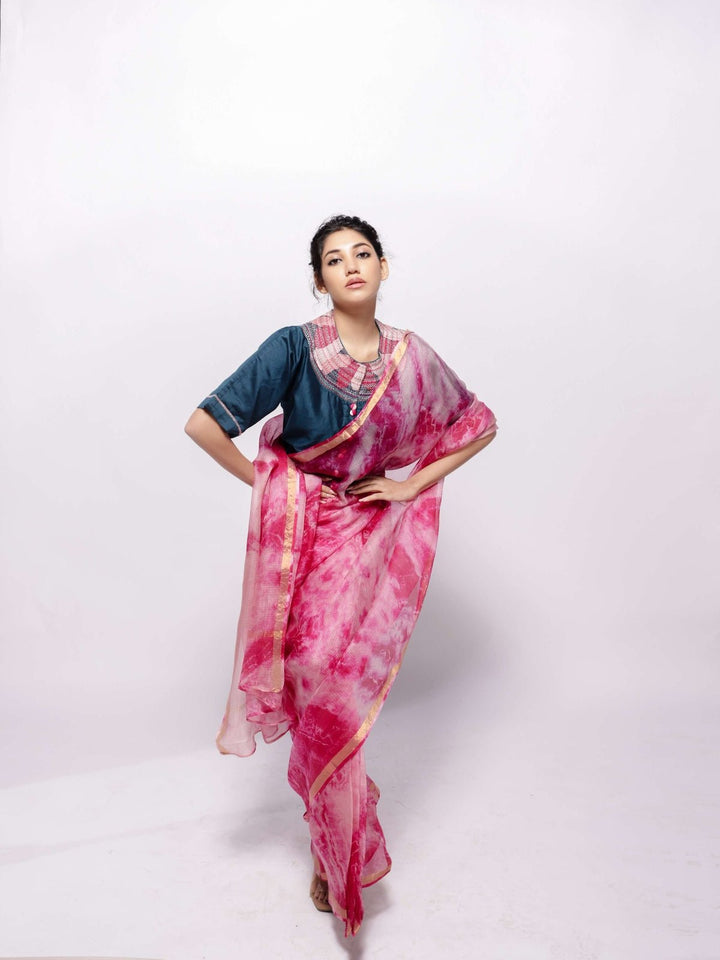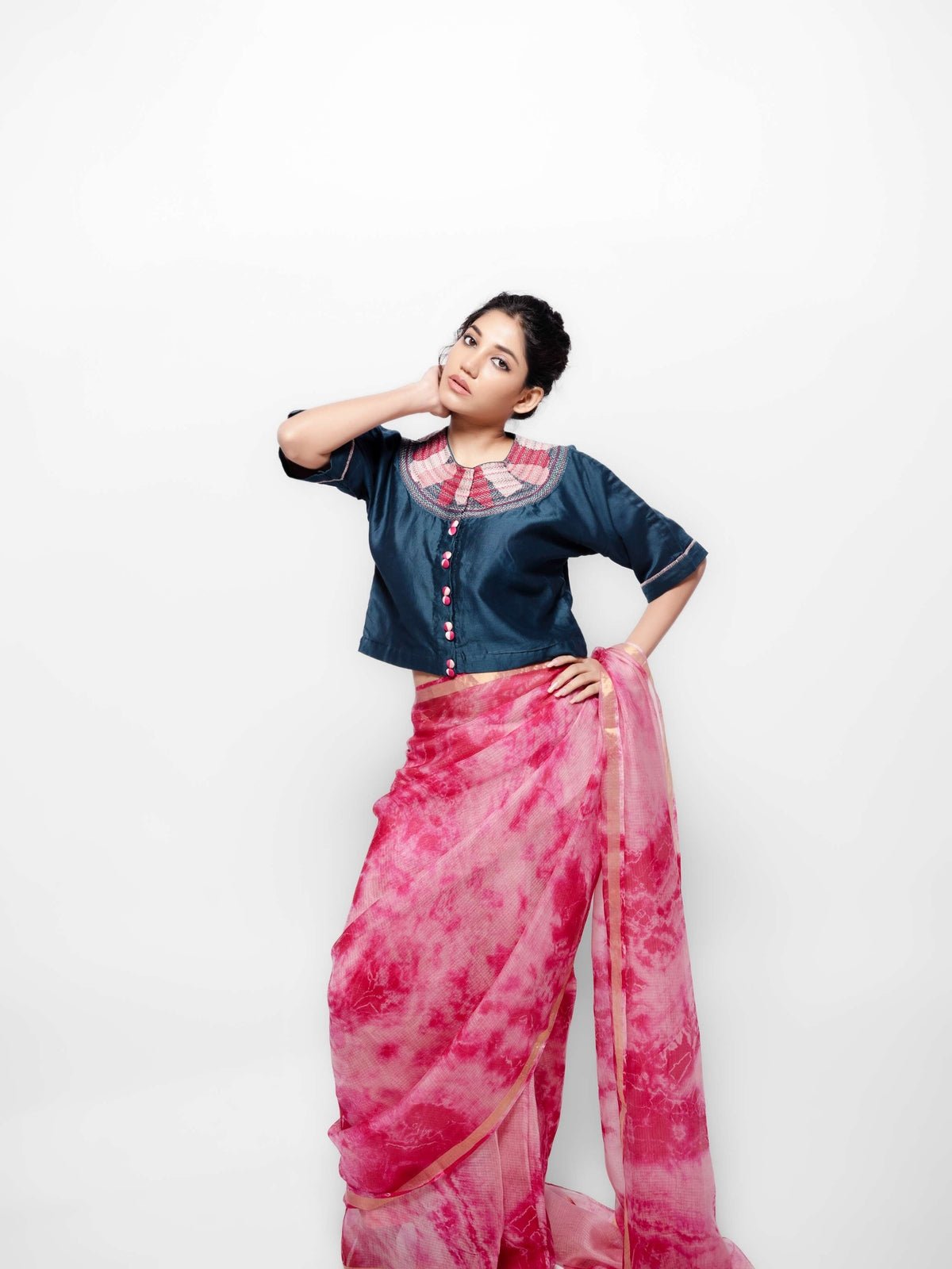 Teal Chanderi crop top has round neck uplifted with multi-colour patch work and hand embroidered Sujani has centre front fabric button detail with hook and eye closure, and half roll-up sleeves accentuated with button-hole stitch.