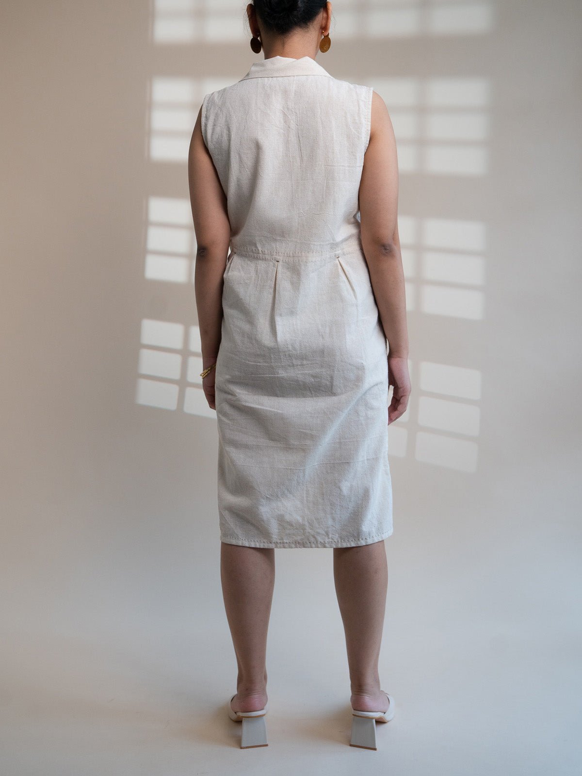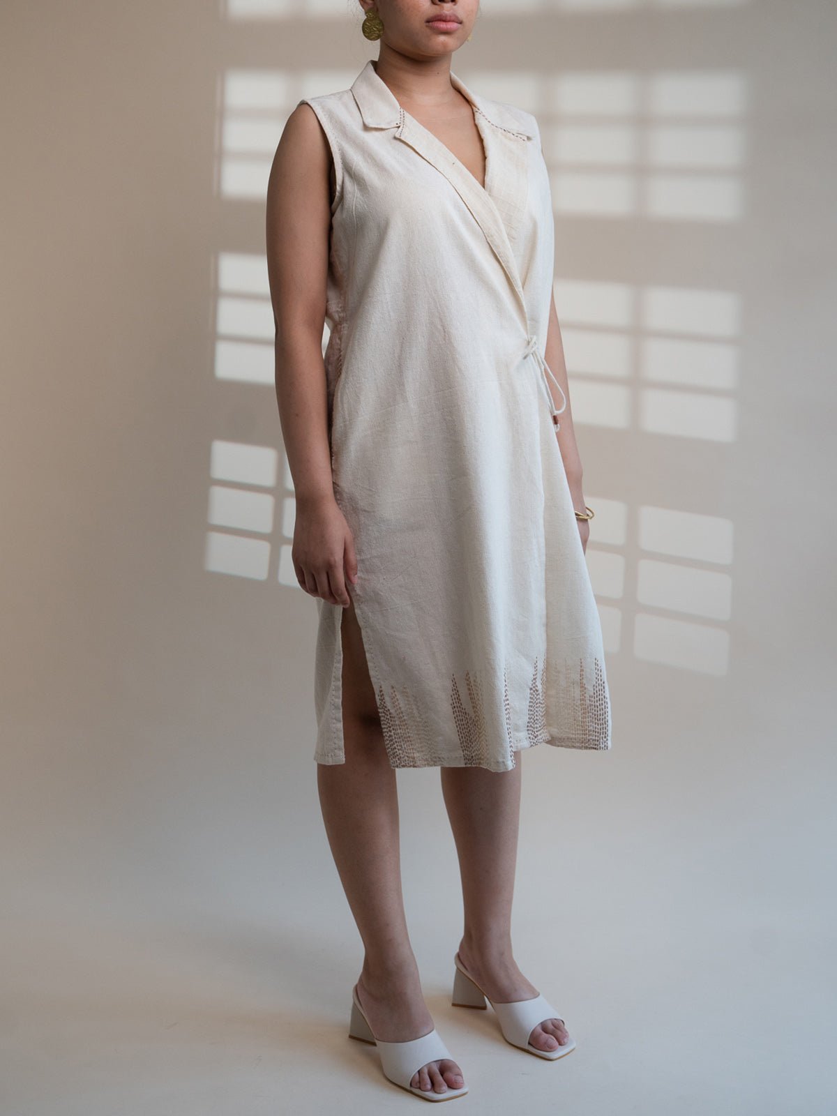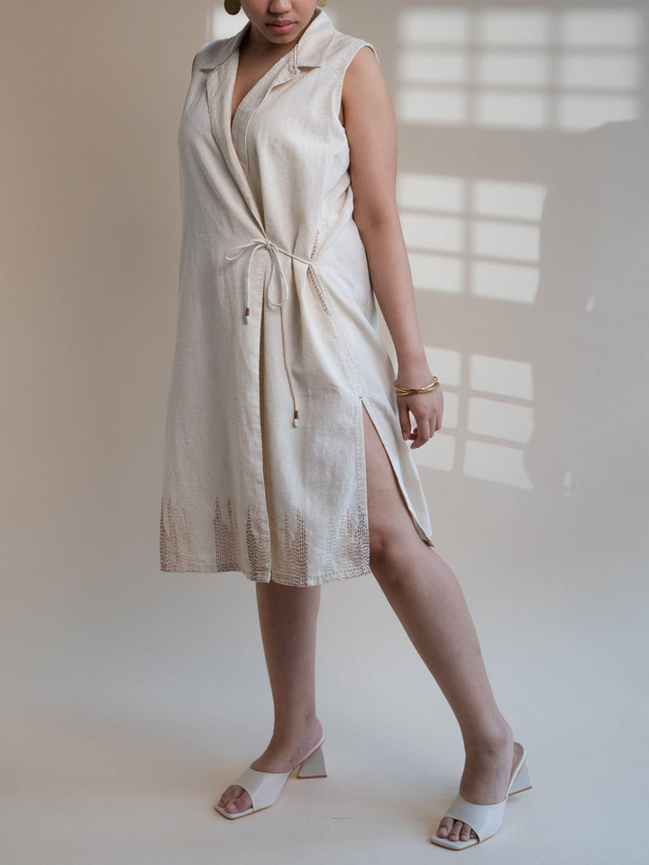 Introducing the Dawning Tie-Up Dress in serene Kora hue, crafted from 100% cotton fibers and natural materials. This 30s cotton long jacket dress features an undyed, unbleached design with a self-checked fabric lapel and waist-cinching drawstring. Adorned with exquisite Kantha embroidery on the hem, it includes practical side pockets and Coconut Shell buttons. Made from Ambar Charkha spun and hand-woven fabric, this 100% biodegradable garment reflects sustainable practices, offering elegance and ethical fashion from seed to stitch in India.