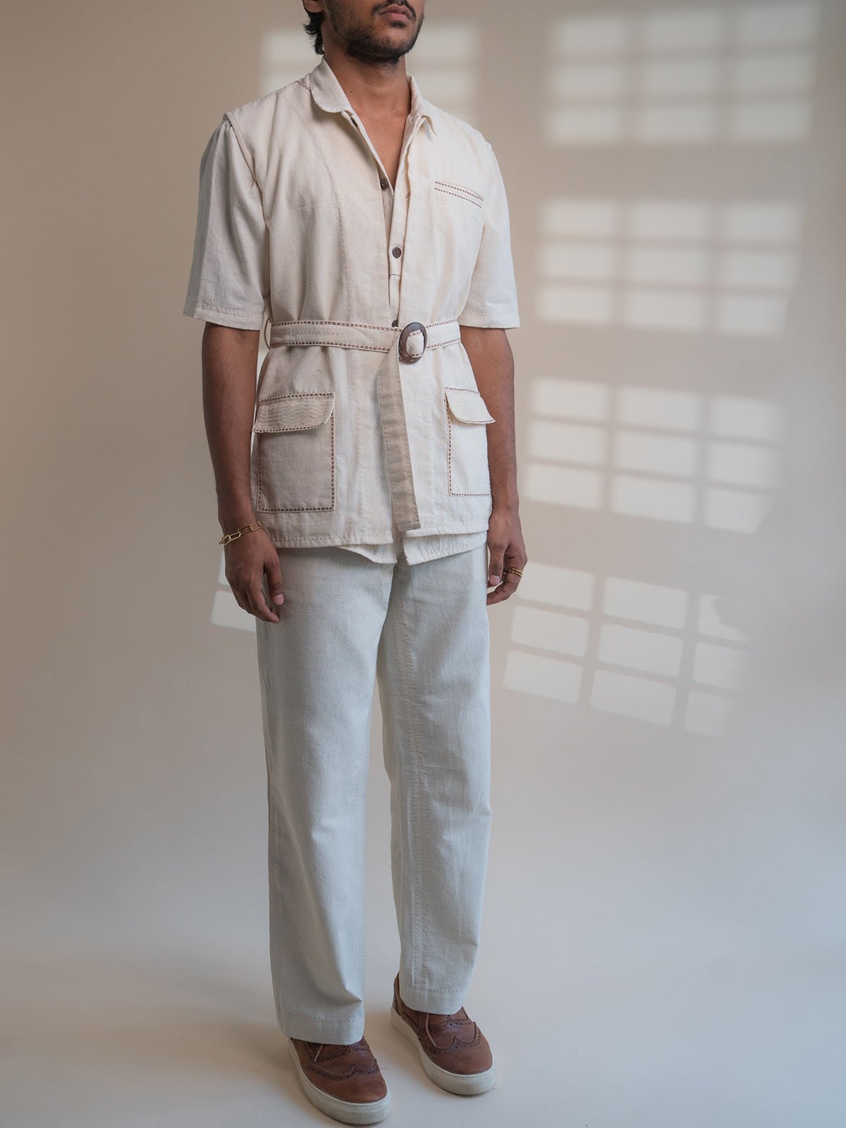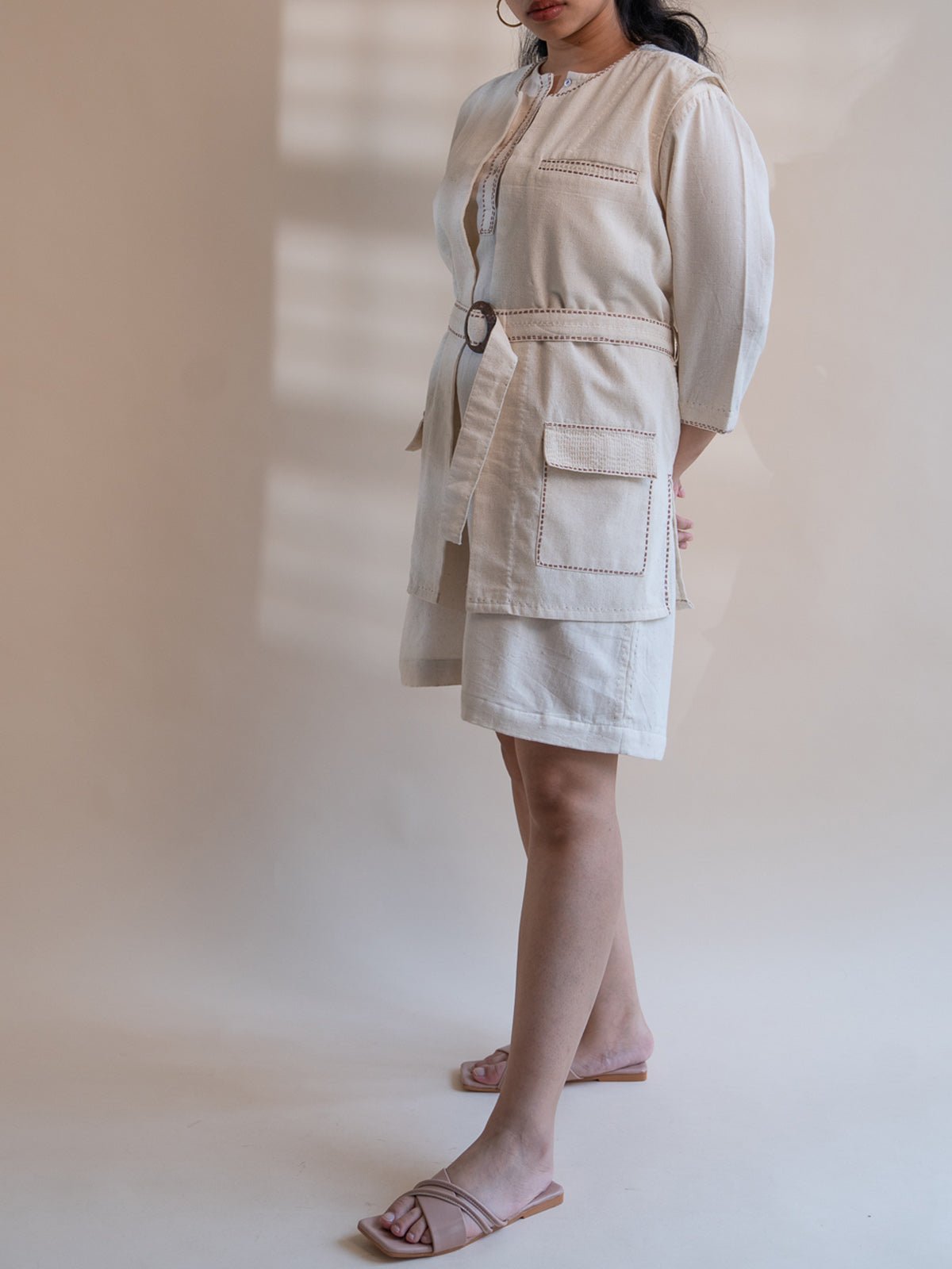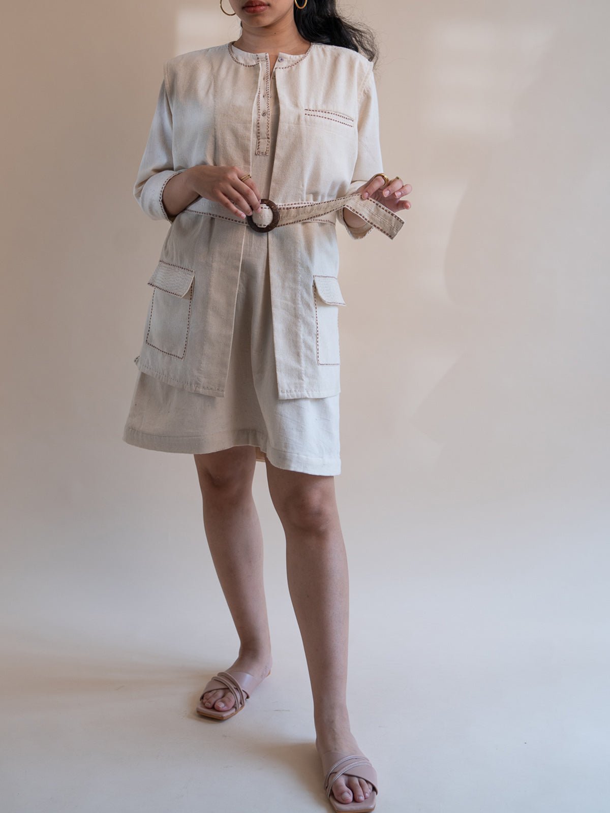The Dawning Unisex Vest in off-white, known as Kora, is crafted from 100% undyed and unbleached 30s cotton. This versatile vest features a round neck, patch pockets, and Kantha hand embroidery along the pockets and belt. Its adjustable and removable belt adds a customizable element to the design. Made from Ambar Charkha spun and handwoven fabric, this garment showcases natural variations in color and texture. Fully biodegradable and ethically made in India from seed to stitch, it embodies sustainable and adaptable fashion.