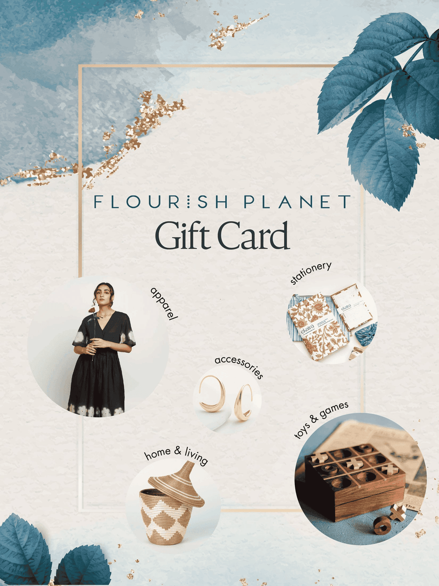 Apparel, accessories, decor, toys, this gift is of choices that are good for the planet and for its people. The Flourish Gift Card lets you choose from handcrafted collections that are ethically produced and eco-friendly, for gifts that tell a story.