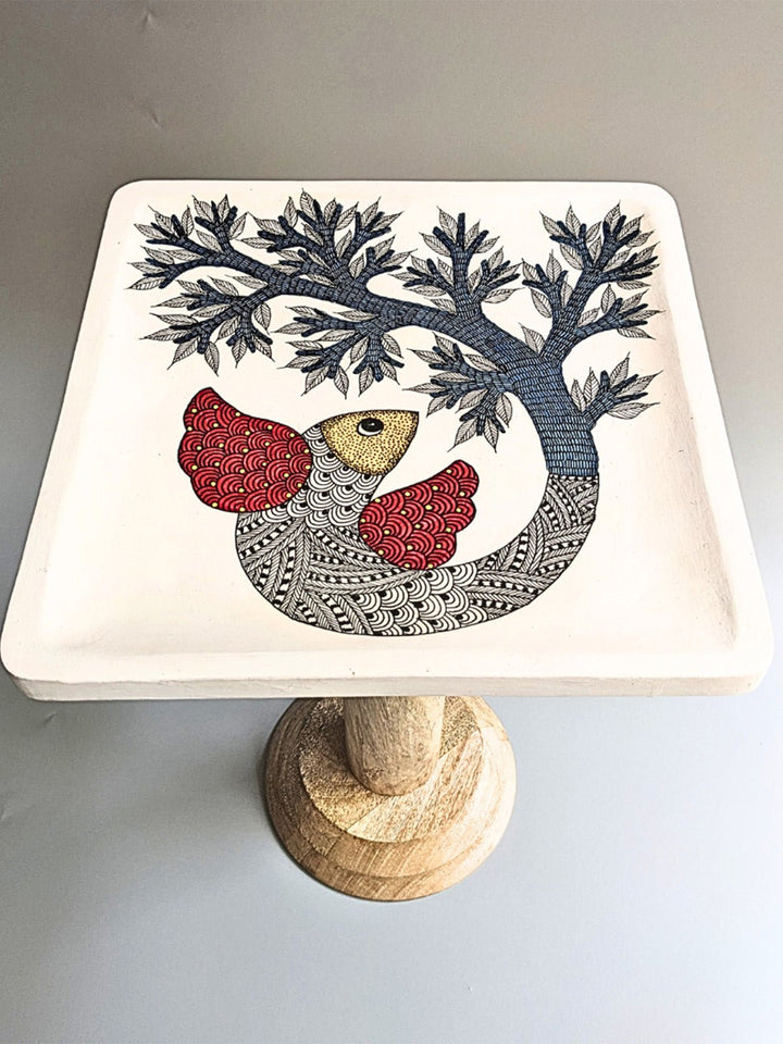 Immerse yourself in the captivating narrative of our sustainable, hand-painted solid wood folding table/stool, skillfully crafted by tribal Gond artists from Madhya Pradesh, India. Each stroke tells a tale that intertwines nature and humanity, honoring the essence of all living beings. Painted in serene white hues, this piece not only exudes artistic finesse but also embodies the cultural richness of Indian craftsmanship.