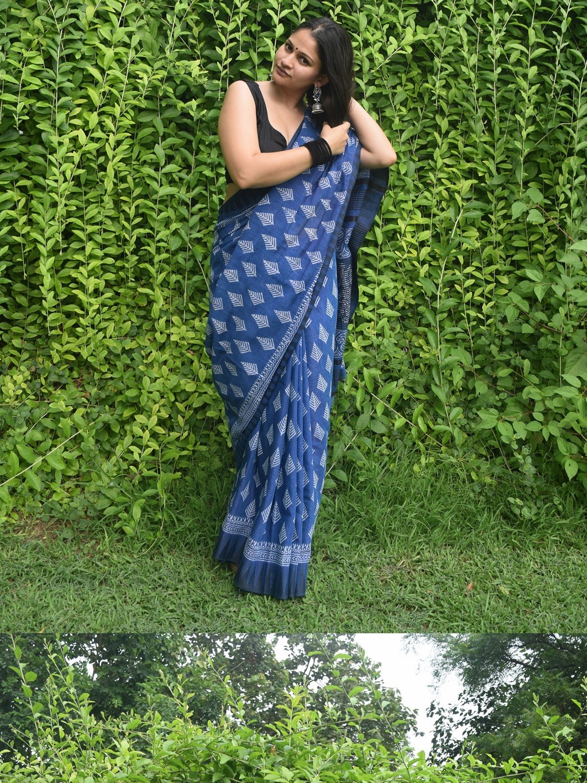 Neyra Blue Hand Block Printed Katan silk & Linen Saree