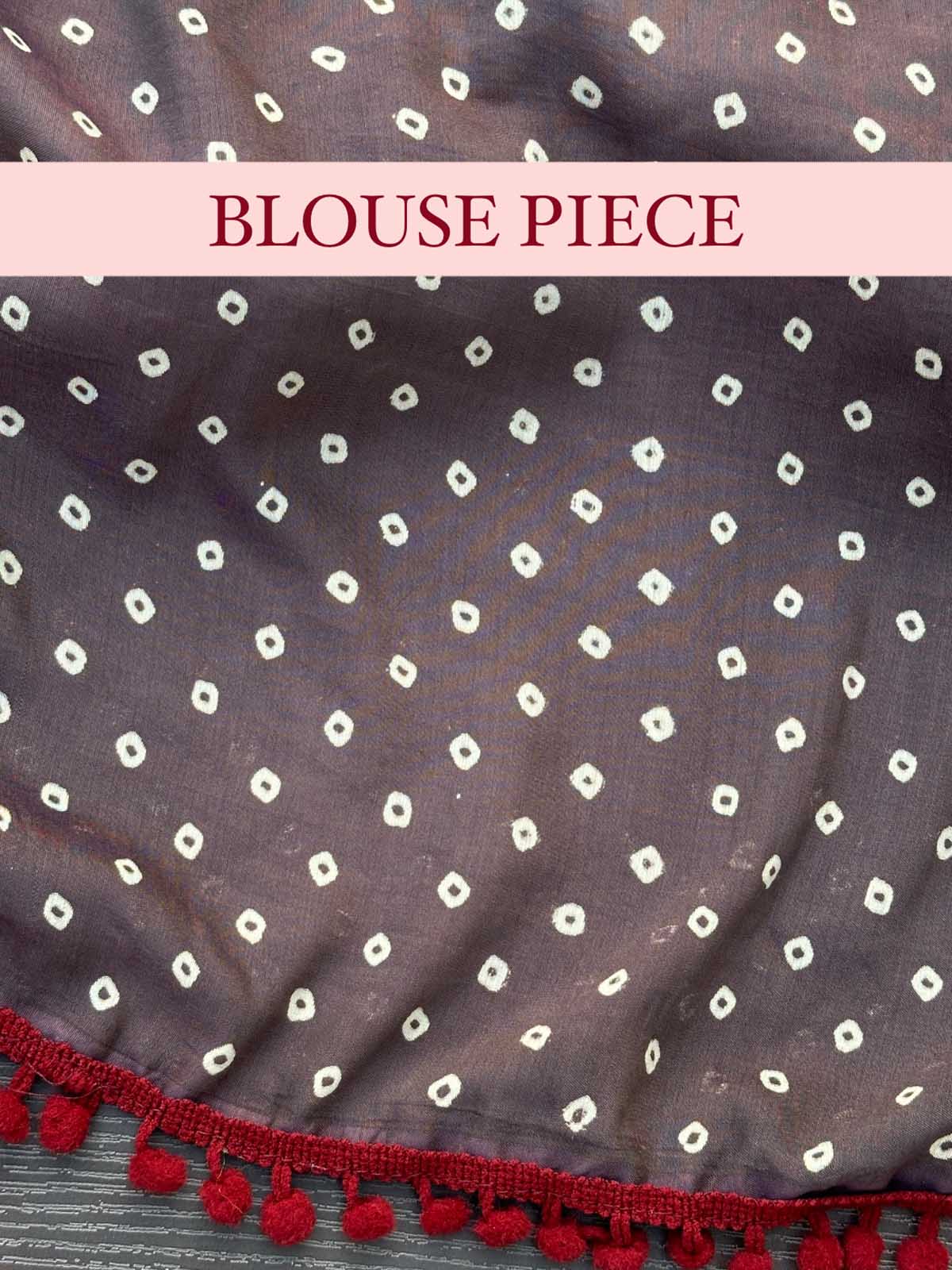 Indulge in the luxury of this hand-block printed brown muslin saree with a beautiful paisley pattern and playful Pom Pom border. Upgrade your wardrobe with this paisley perfection!