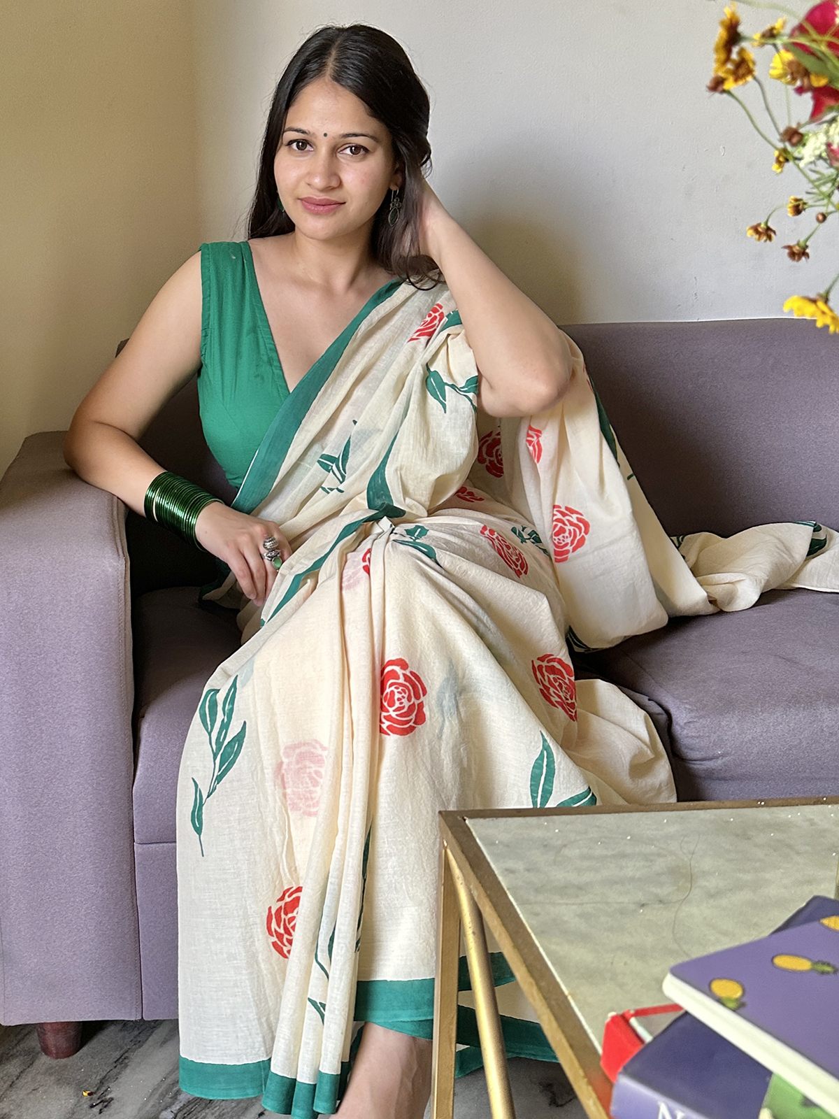 Say hello to Phool Bahar, the dreamy saree you've been searching for on Pinterest. Made from a soft mul mul cotton blend, it features a beautiful combination of orange and green with beautiful rose prints. Finished with premium lace, it's an effortlessly aesthetic drape for any occasion.