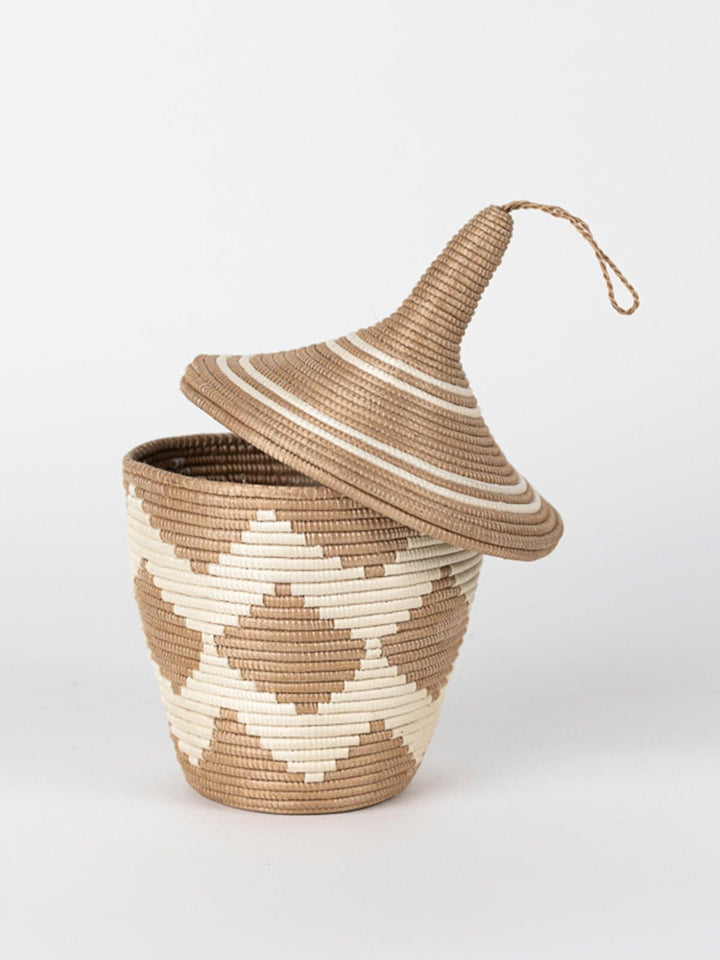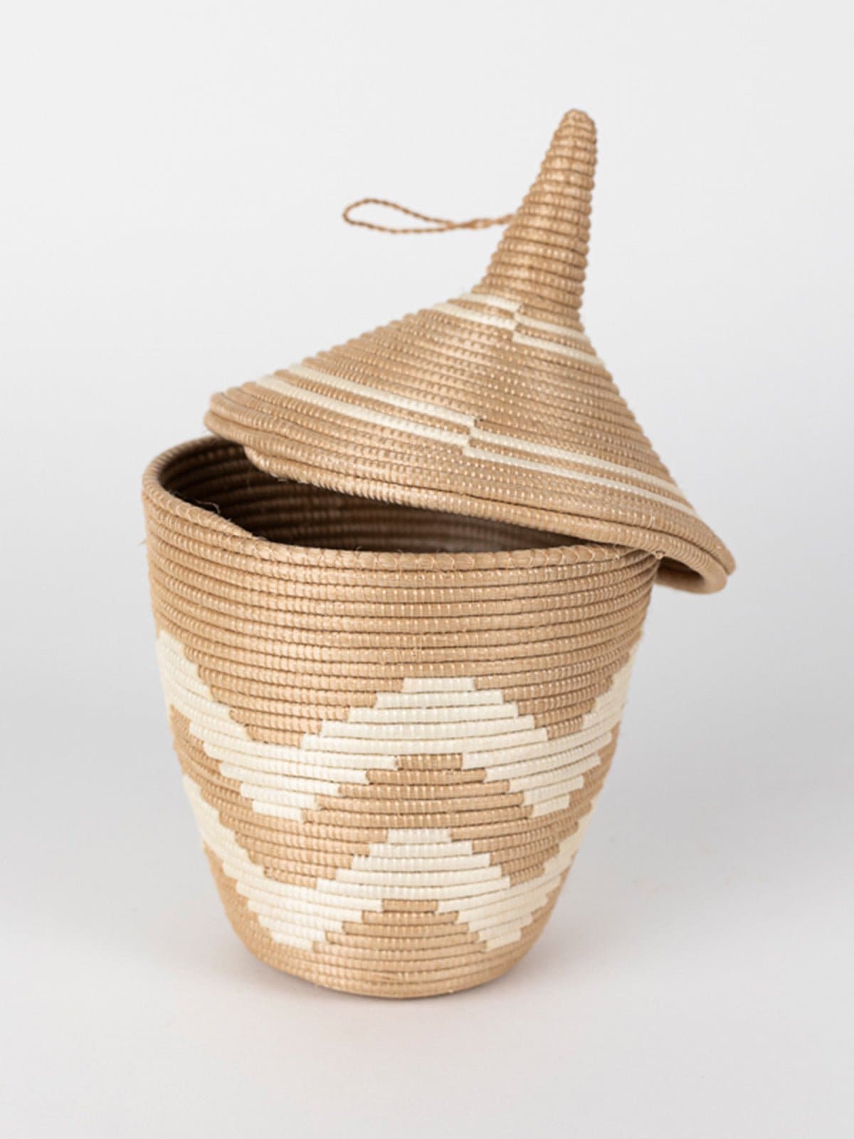 Our Sisal Peace Basket is a beautiful and practical way to bring a distinctively Rwandan touch to your decorating, storing, or gift-giving! Across the thousand hills of Rwanda, groups of women are sitting together, weaving sisal baskets in the traditional way. The sisal fiber is extracted from the long leaf of a plant that resembles aloe. When the green fleshy part of the leaf is stripped away, white string-like fibers remain. These fibers are cleaned and dried, cooked in dye, and then woven into traditional forms- such as the peaked peace basket, or less traditional forms- like earrings or napkin rings.