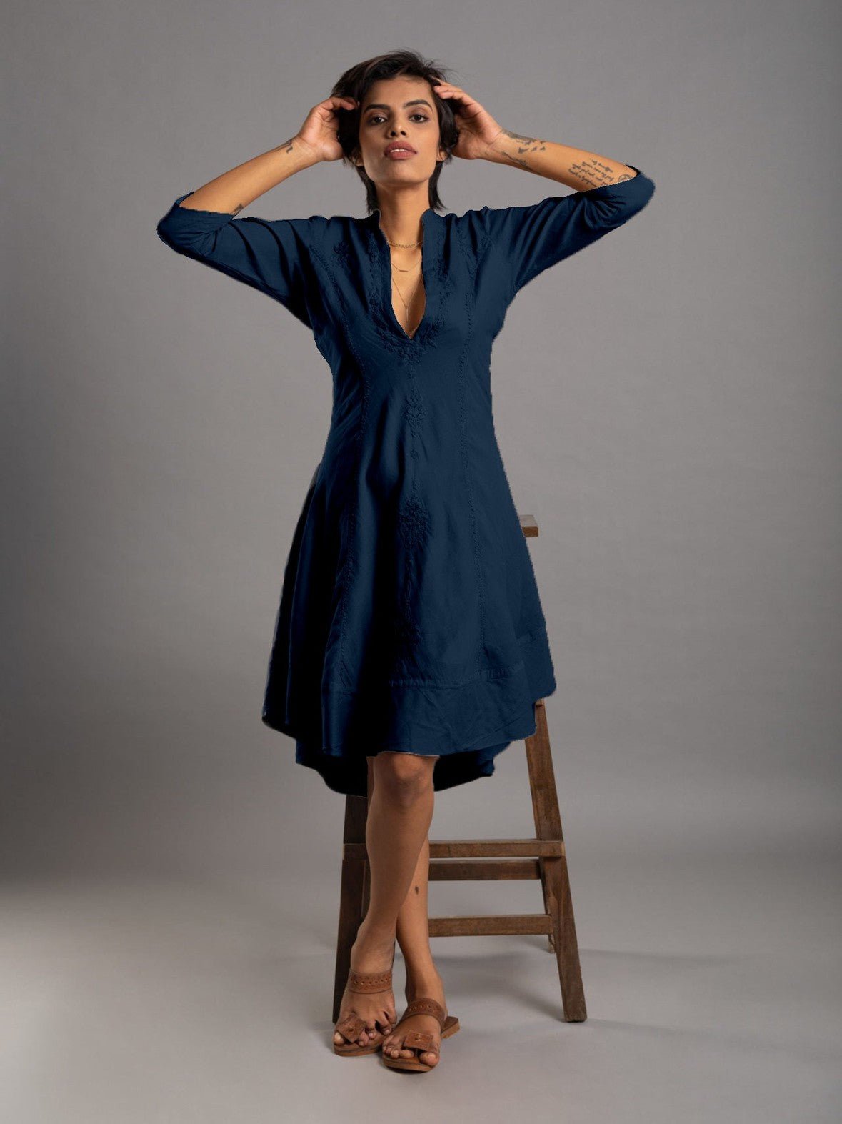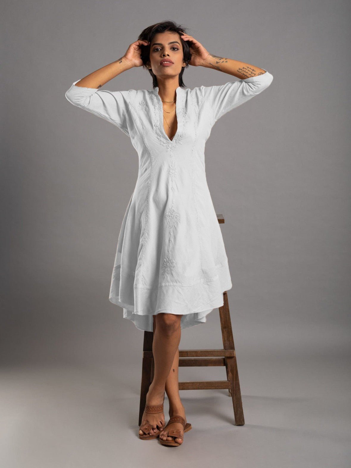 Made in 100% cotton, the Victoria dress has a plunging neckline, is cut on bias, and is the perfect combination of stylish and comfortable. It is highlighted with hand embroidered Chikankari motifs.