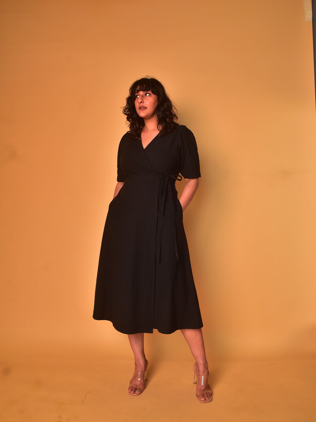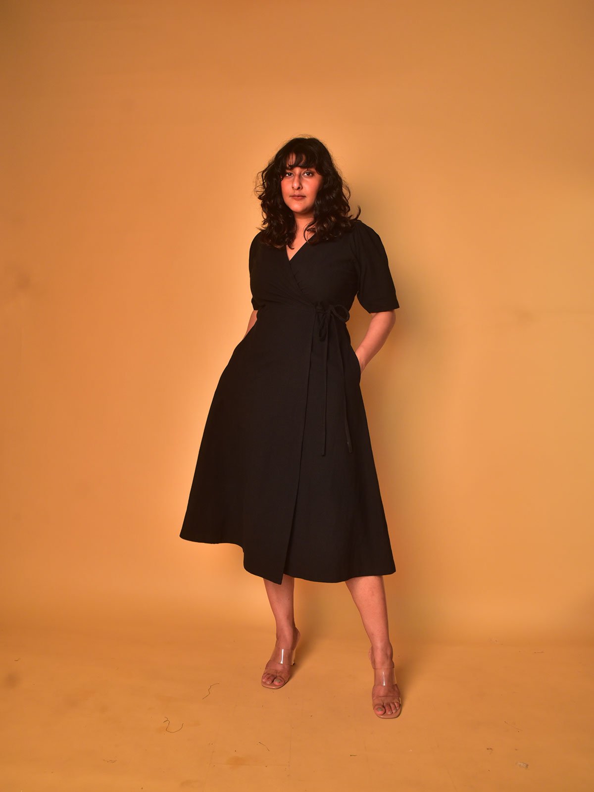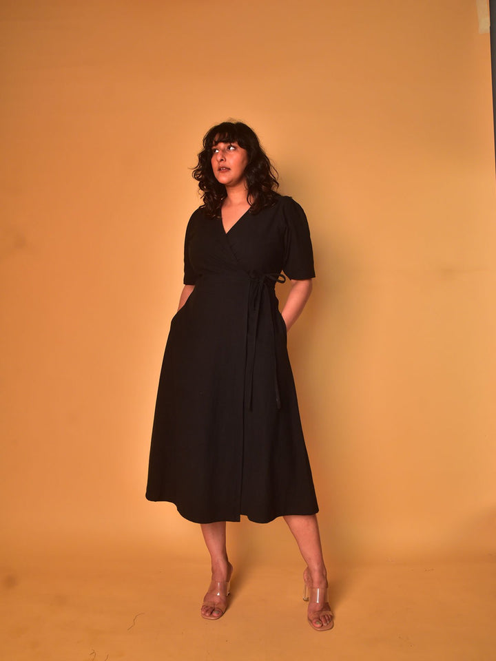 A long, chic wrap dress perfect for turning heads this season! Cut in Black Crinkled cotton, this wrap dress is designed with V-neckline, short pleated sleeves and a tapered skirt. Pair with black heels for a boardroom-to-bar look.