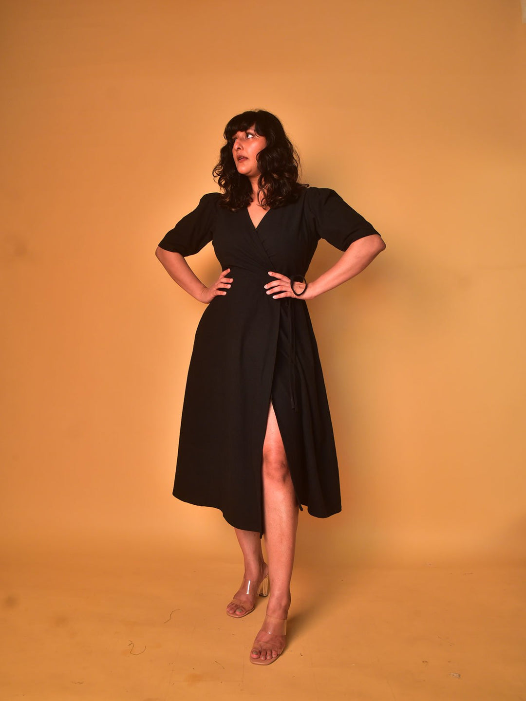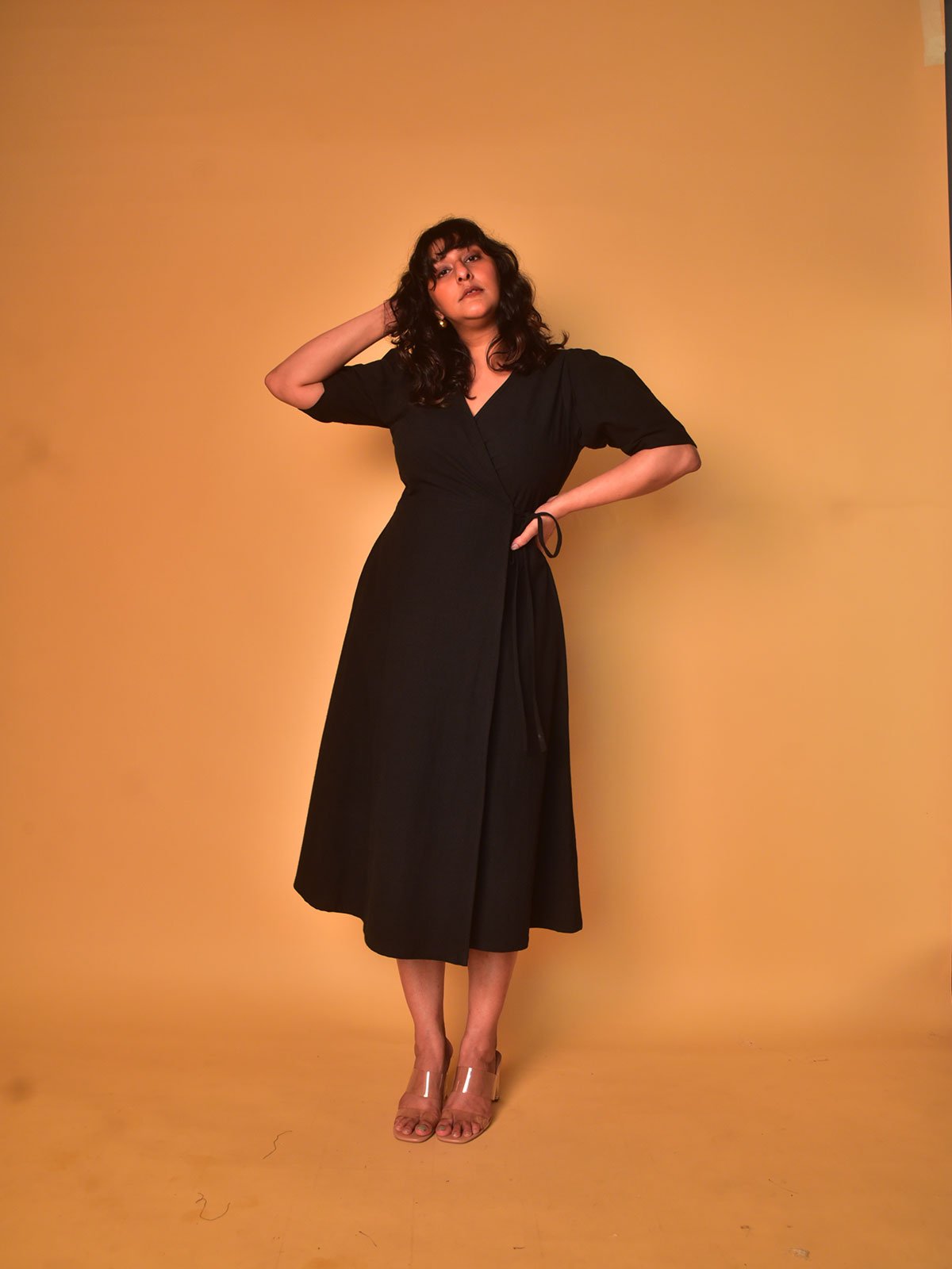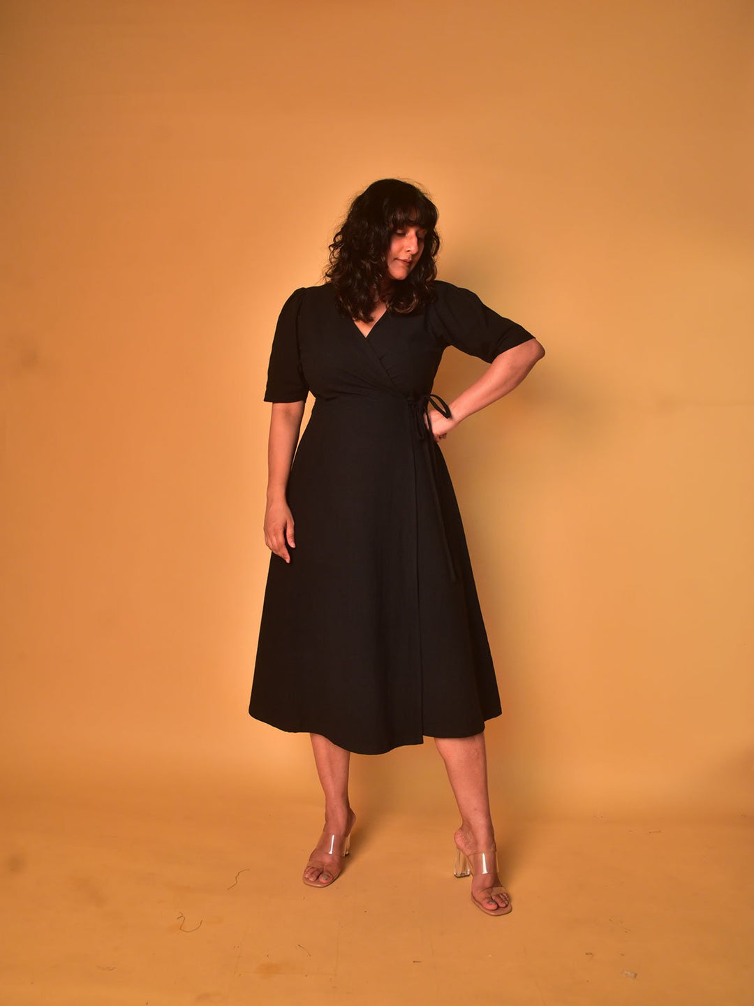 A long, chic wrap dress perfect for turning heads this season! Cut in Black Crinkled cotton, this wrap dress is designed with V-neckline, short pleated sleeves and a tapered skirt. Pair with black heels for a boardroom-to-bar look.